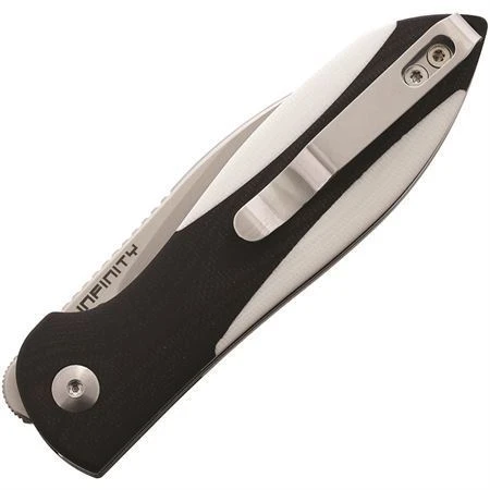 Model – KIV3579N2. Kizer 3579N2 – Infinity Linerlock Knife G10. 3.88″ (9.86cm) closed. 3″ (7.62cm) satin finish Bohler N690 stainless blade. Black and white G10 handle. Extended tang. Pocket clip. Boxed. Made in China.