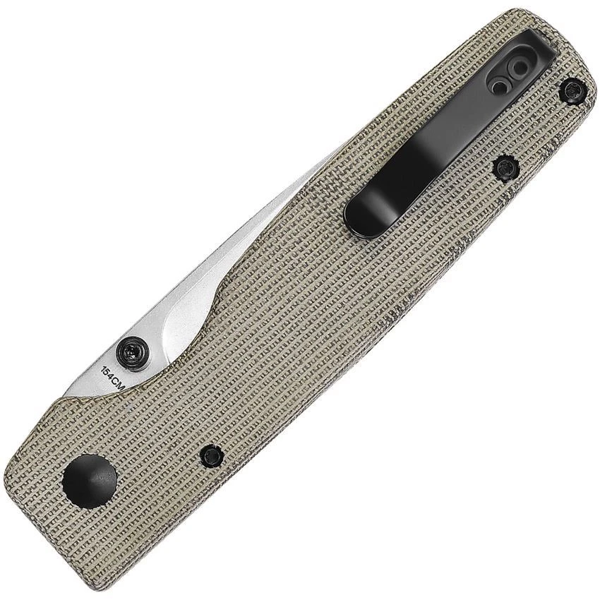Model/Part Number – KIV4605C1. Kizer Original XL Button Lock. 4.25″ (10.8cm) closed. 3.25″ (8.26cm) stonewash finish 154CM stainless blade. Green canvas micarta handle. Thumb stud. Pocket clip. Boxed. Made in China.