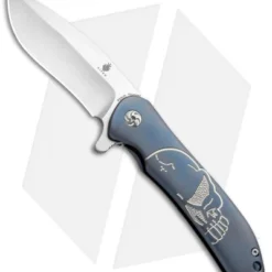 The Kizer Hustler offers a substantial design from knife-maker Matt Cuchiara. This heavy duty knife features a wide drop point blade made from CPM-S35VN steel. Two titanium handle scales provide a solid framework for the blade and a clean, classic appearance. The Hustler is equipped with a smooth ball-bearing pivot system and a blade flipper for quick and reliable deployment. A frame lock, custom pivot, and a tip-up carry pocket clip finish off the design. This version of the Hustler features a stonewashed blade and a blue titanium handle with an etched skull design.