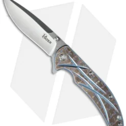 Lightweight and sleek, this classy folder features a stonewash, S35VN stainless steel, clip point blade, ambidextrous thumb studs, and an anodized, right hand, tip-down pocket clip. This titanium folding knife from Kizer Cutlery is elegant to look at and has smooth action. The 6Al4V Titanium handle has a blue anodized finish and uses the frame lock construction for secure blade lock up.