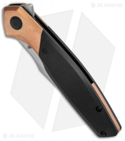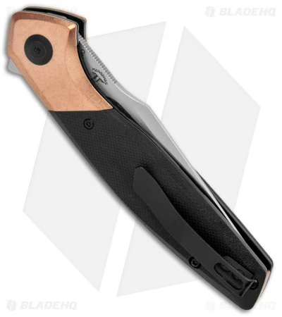 - Textured black G-10 handle with copper bolsters.