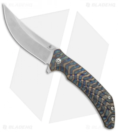 The Kizer Nomad Flipper features a Dirk Pinkerton design inspired by the middle-eastern Khanjar dagger. It is outfitted with a stunning upswept blade that fits perfectly with the contoured lines of the titanium handle. The blade is made from satin finished CPM-S35VN steel and comes with a thumb stud and flipper for quick deployment. Elegant contouring and machining accentuate the flamed titanium handle. Includes a tip-up carry pocket clip for right hand use. The Kizer Nomad offers the blade control and versatility that are essential to a good folding knife.